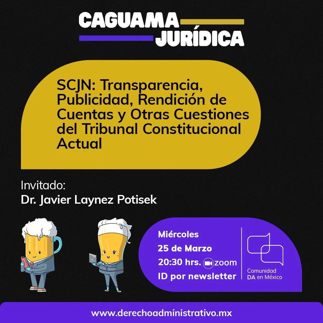 La primera va en relación a la duda de mucha gente: ¿cómo puedo participar en la caguama jurídica? Muy simple. Nos reunimos virtualmente todos los miércoles a las 20:30 horas de la Ciudad de México y el enlace se envía ese mismo día, por la tarde, a quienes se suscriben gratuitamente al newsletter de DA.MX.® (www.derechoadministrativo.mx).